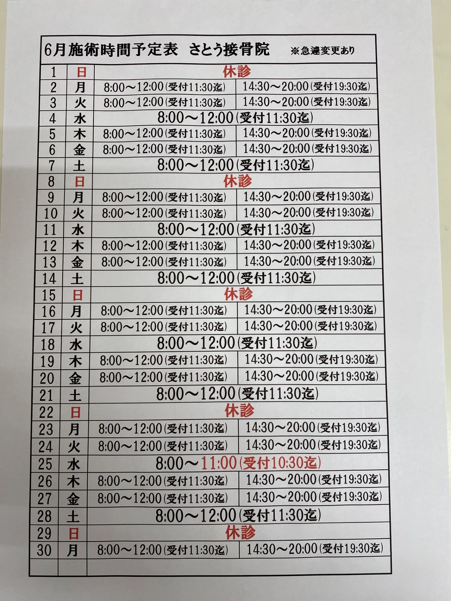6月施術時間予定表を載せさせて頂きます。