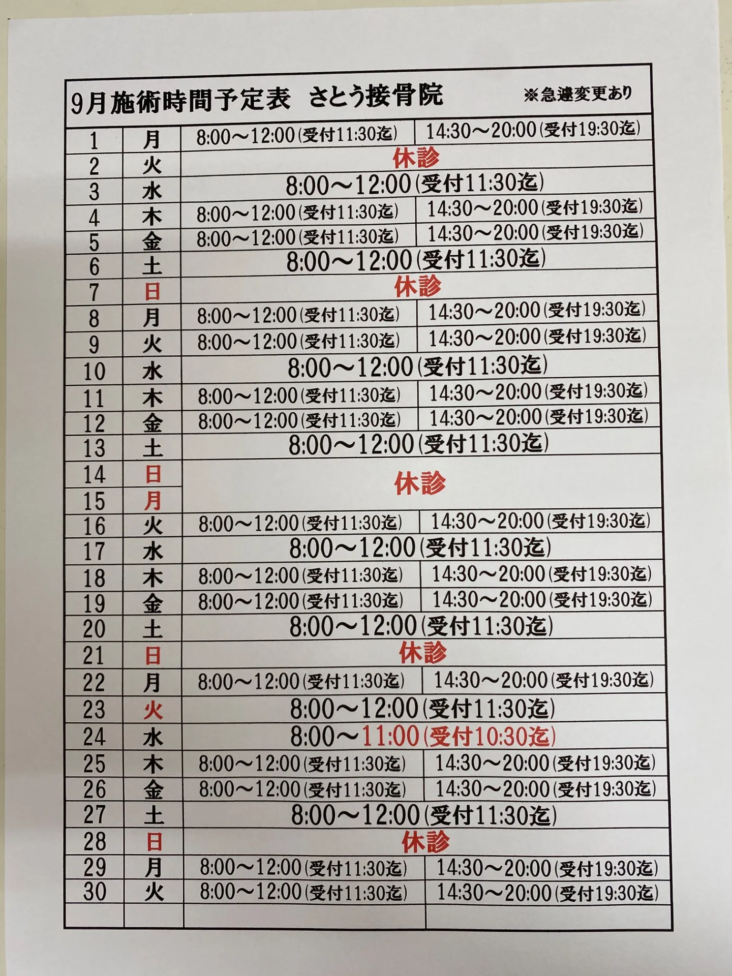 急遽、施術時間変更.休診.受付終了時間前に閉める場合があります