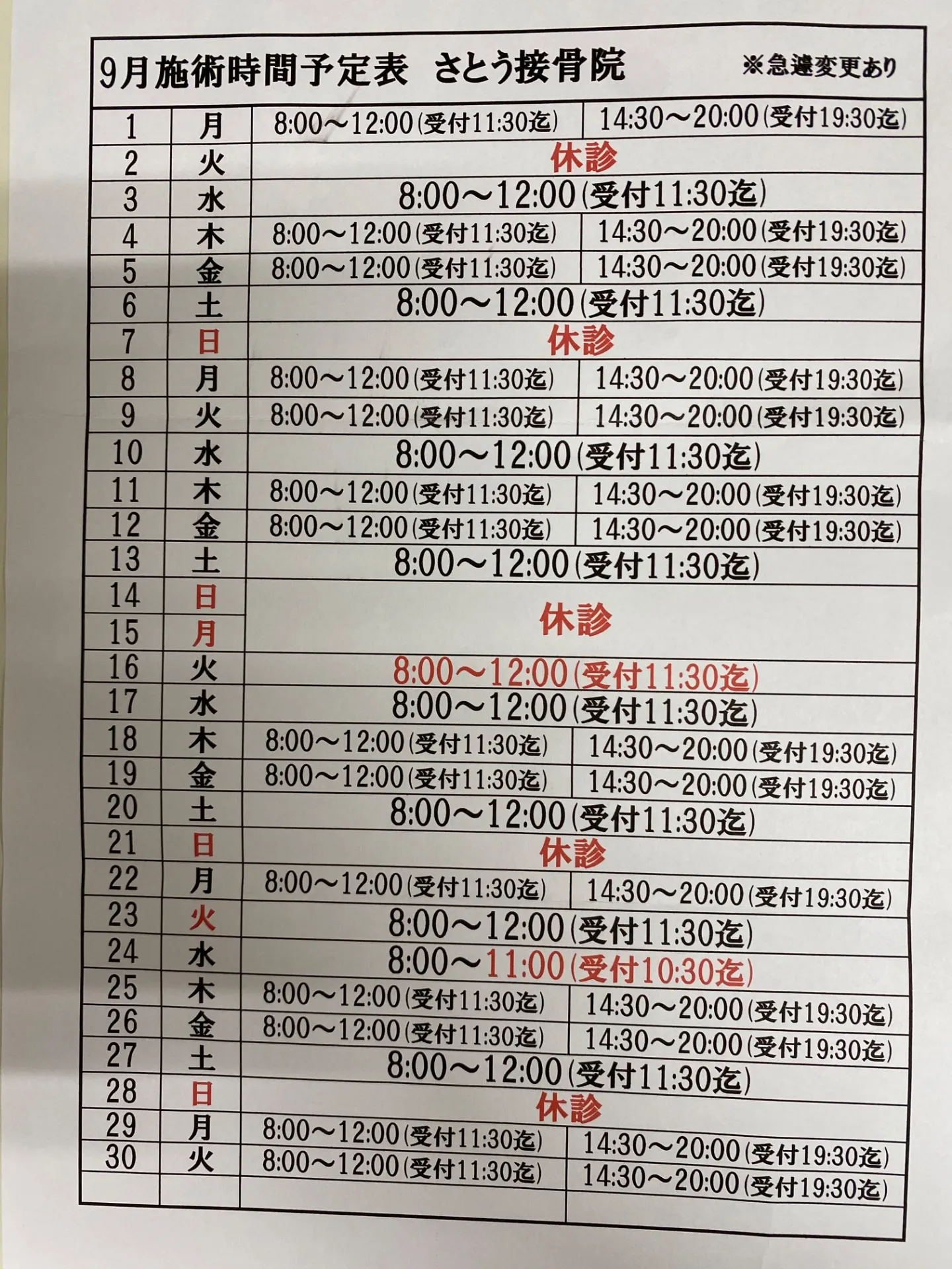 急遽、施術時間変更.休診.受付終了時間前に、受付終了で、閉める場合があります